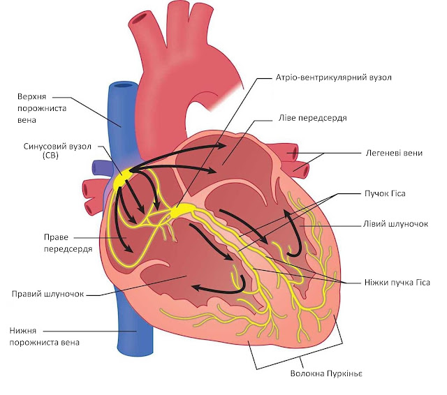 Синусовий (сино-атріальний) вузол — це клітинна структура, розташована у верхній частині правого передсердя і є “водієм ритму” першого порядку в нормі. Ця зона створює електричні імпульси з певною частотою; ці імпульси охоплюють серце через його провідну систему (“нерви” серця). З якою частотою ця зона генерує імпульси, з такою ж частотою і скорочується серце (мал.1).