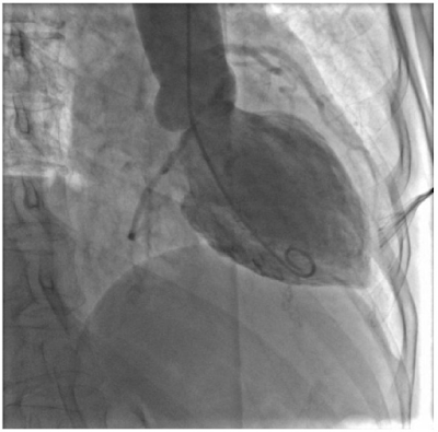 Катетер під рентгенологічним контролем буде проведено до лівого (або правого) шлуночка серця (мал.4) і під високим тиском (за допомогою спеціального автоматичного шприца) введуть рентгенконтрастну речовину, яка з плином крові заповнить порожнину шлуночка.